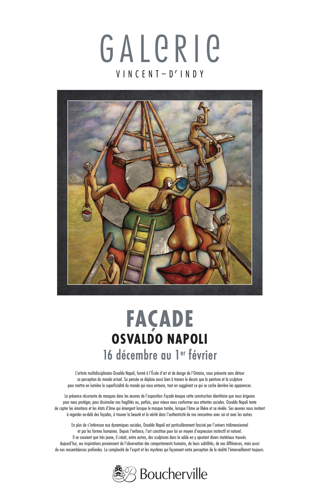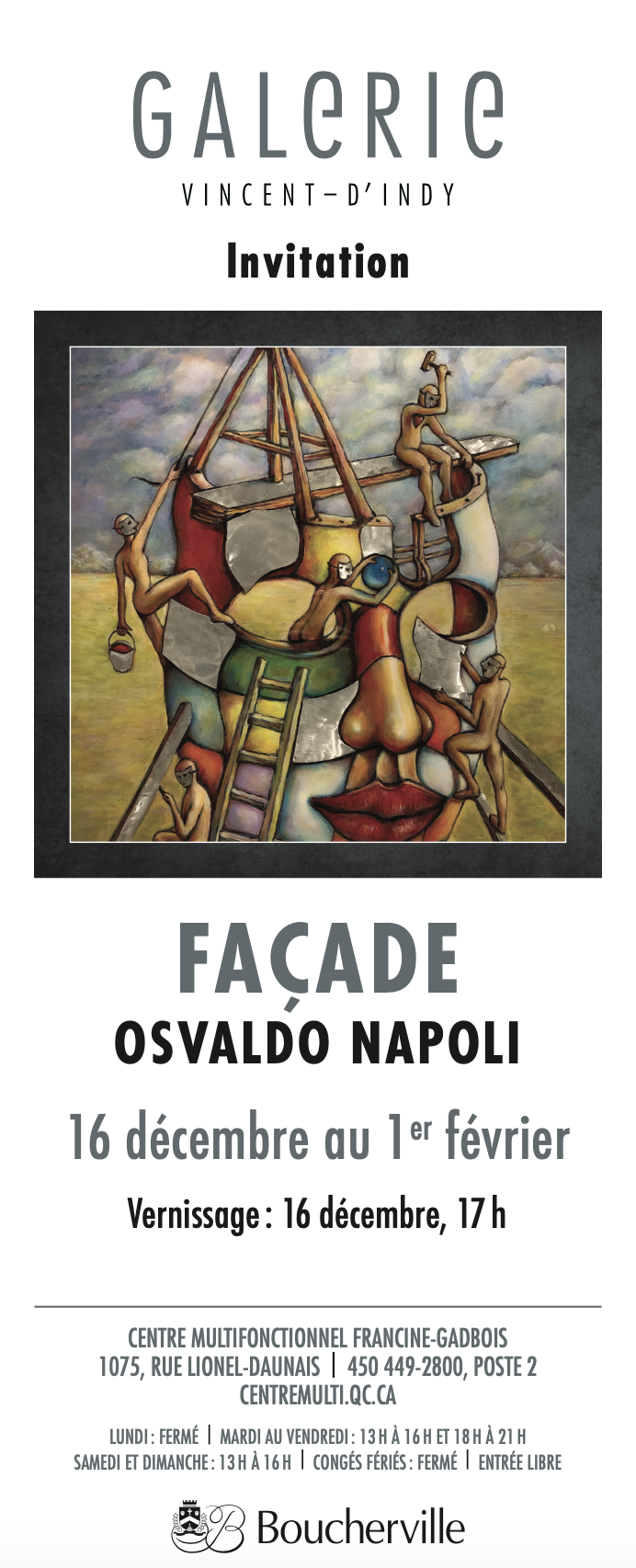 This season, the gallery will host the exhibitions La vie au sommet and Raku by Alain Daignault and his students from the Atelier des Arts visuels de Boucherville, Je vole by Roger Renaud, Bien chez soi by Cercle de Fermières Boucherville, Vibrance – abstraction autistique by Neo-Kao and finally, Façade by Osvaldo Napoli.